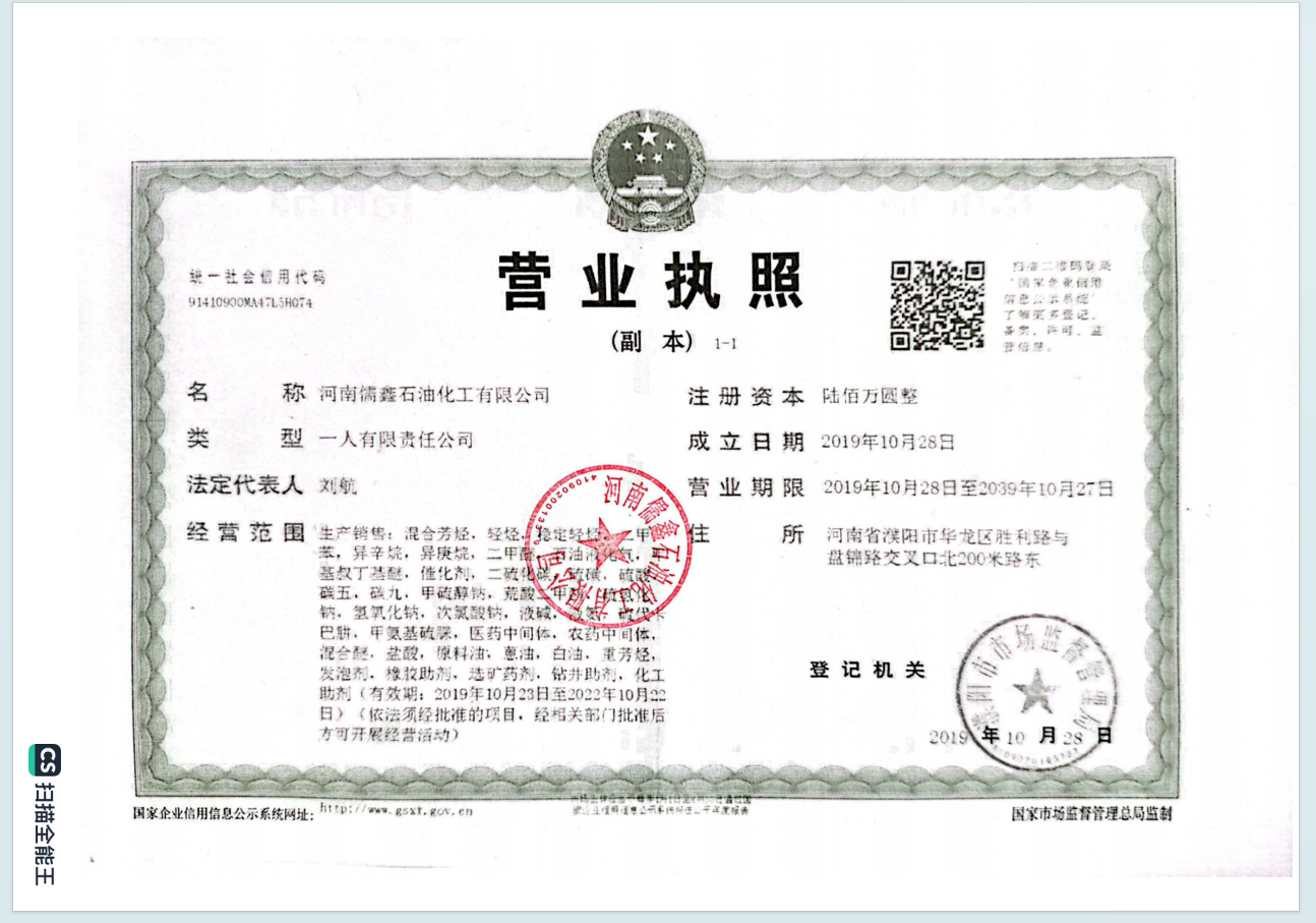 生产销售:混合芳烃,轻烃,稳定轻烃,二甲苯,异辛烷,异庚烷,二甲醚,石油液化气,甲基叔丁基醚,催化剂,二硫化碳,硫磺,硫酸,碳五,碳九,甲硫醇钠,荒酸二甲酯,硫氢化钠,氢氧化钠,次氯酸钠,液碱,液氨,硫代卡巴肼,甲氨基硫脲,医药中间体,农药中间体,混合醚,盐酸,原料油,蒽油,白油,重芳烃,发泡剂,橡胶助剂,选矿药剂,钻井助剂,化工助剂(有效期:2019年10月23日至2022年10月22日)[详细]